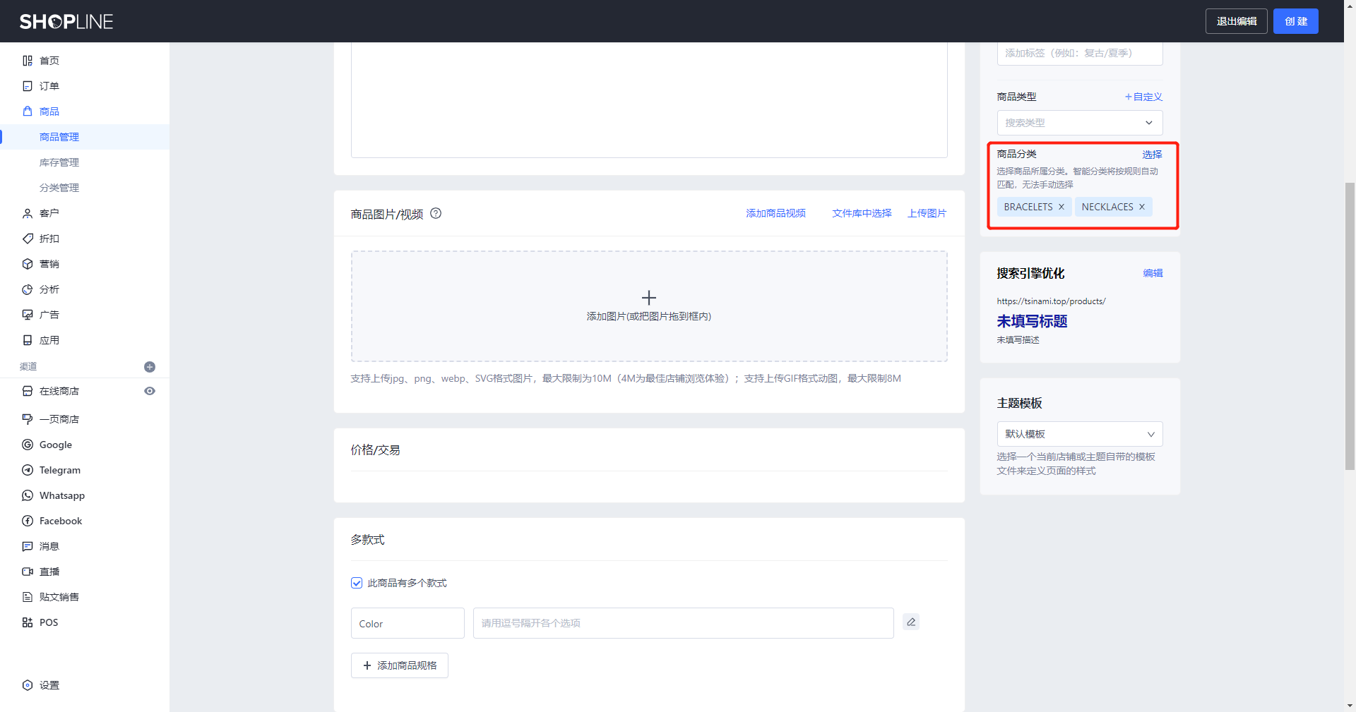 • 最多可添加50个商品分类。当已选分类达到50个时,下拉菜单中未选中的项目disabled。