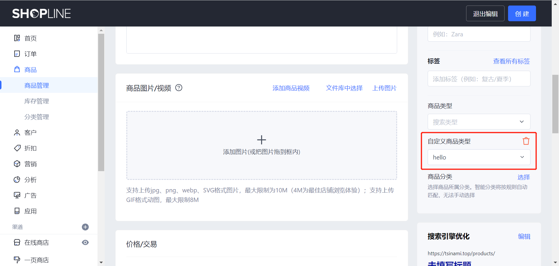 • 可选值:当前店铺下有关联商品的自定义商品类型。